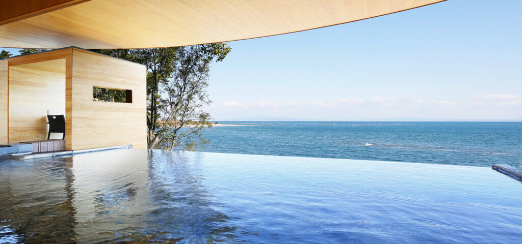 ホテルの露天風呂からのんびりと有明海を眺め、